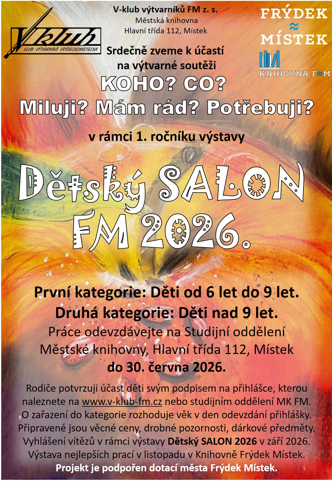 V-klub připravuje Dětský Salon 2026. K účasti jsou srdečně zváni všichni dětští umělci od 6 let do 18 let. Společná výstava proběhne v září 2026 ve Slezanu, který se otevírá 1. května 2026, a naše akce bude jedna z prvních, které otestují možnosti nového společenského centra. V rámci Dětského Salonu proběhne i výtvarná soutěž, která tam bude vyhlášená. Zájemce o soutěž přihlásí rodiče na připravené přihlášky v knihovně nebo si je stáhnou z naších stránek a mohou odevzdávat své práce řádně označené jménem, věkem a školou na Studijním oddělení Městské knihovny na Hlavní třída 112, Místek, do konce června 2026. Vítězné a vybrané práce pak v listopadu budou vystavené právě v naší městské knihovně.